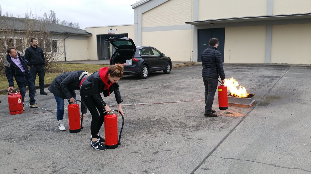 Im Rahmen der Ausbildung wurden die Grundfragen der betrieblichen Brandschutzorganisation sowie des organisatorischen Brandschutzes geschult. Themen wie Brandursachen kamen ebenso zur Sprache wie der richtige Weg der Alarmierung, Evakuierung oder Löschmittel. Eine praktische Übung schloss sich an, in der die Mitarbeiter der Messe Giessen den Umgang mit Handfeuerlöschern lernten.