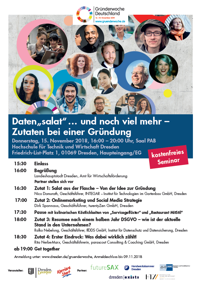 Im Rahmen der Gründerwoche Deutschland (12. bis 18. November) laden das Amt für Wirtschaftsförderung Dresden und die KarriereStart am 15. November gemeinsam mit Dresden exists – Gründungsinitiative an der TU Dresden, futureSAX – die Innovationsplattform des Freistaates Sachsen, Handwerkskammer Dresden sowie Industrie- und Handelskammer Dresden zum kostenfreien Gründerseminar in den Saal PAB der Hochschule für Technik und Wirtschaft (HTW) Dresden ein. Der Einlass erfolgt 15.30 Uhr, die Veranstaltung endet um 20.00 Uhr. Unter der Überschrift "Daten'salat ... und noch viel mehr - Zutaten bei einer Gründung" befassen sich die Vorträge unter anderem mit den Themen Onlinemarketing und Social Media sowie DSGVO. Ab 19.00 Uhr finden sich die Teilnehmer zum "Get Together" zusammen. Anbei finden Sie das komplette Seminarprogramm zur Ansicht und zum Download.